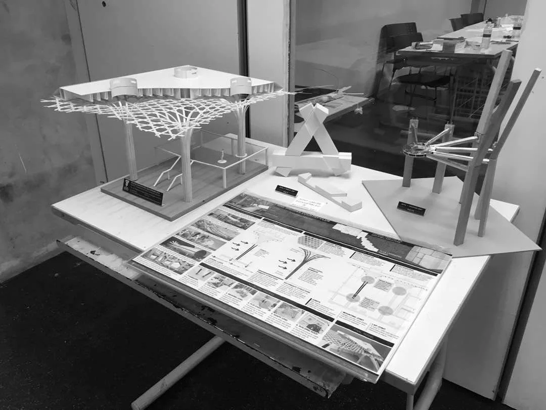 The structure is a conceptual extraction of the “bamboo weave”. The weave is structurally superior than other rectangular weaving since the structural elements run in 3 dimensions.