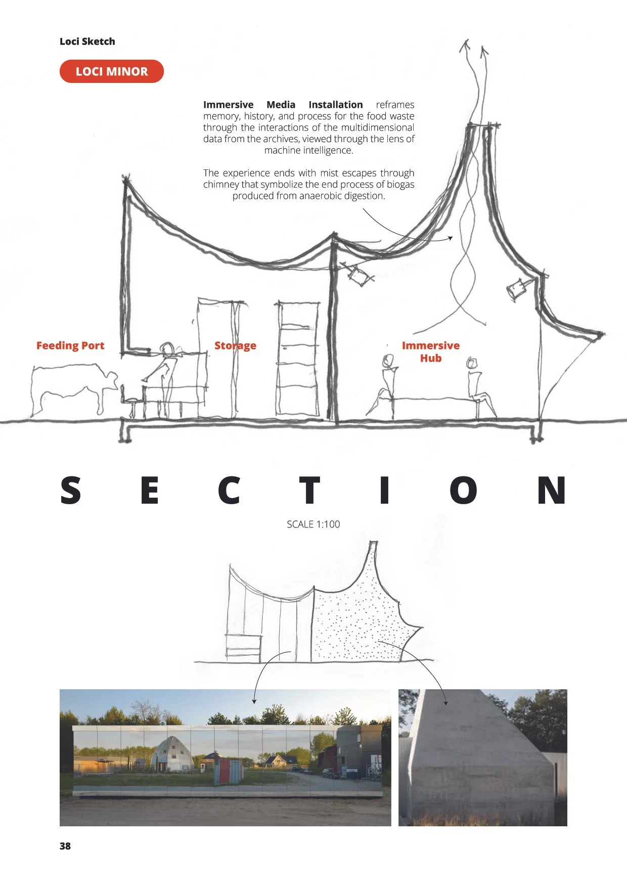 Integration of a food processing and anaerobic digestion facility with an educational focus, showcased through a projection on the frustum roof and complemented by outdoor seating.